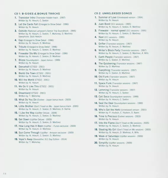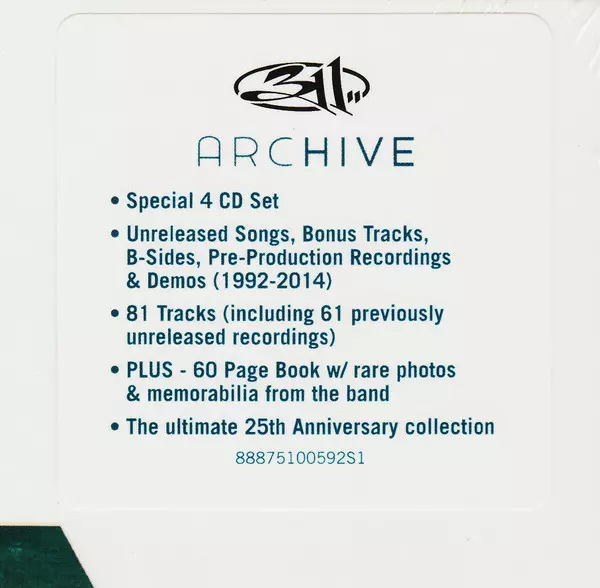 311: Archive La version sur 4CD/Coffret en Remasterisé édition. Cette édition particulière a été publiée en ÉTATS-UNIS dans la maison d'édition Volcano (2) En collaboration avec Legacy Le 30 juin 2015. Album couvre tous les genres Rock, Reggae, Hip Hop, Alternative rock, Funk Metal, Pop-Rap et Stoner-Rock.