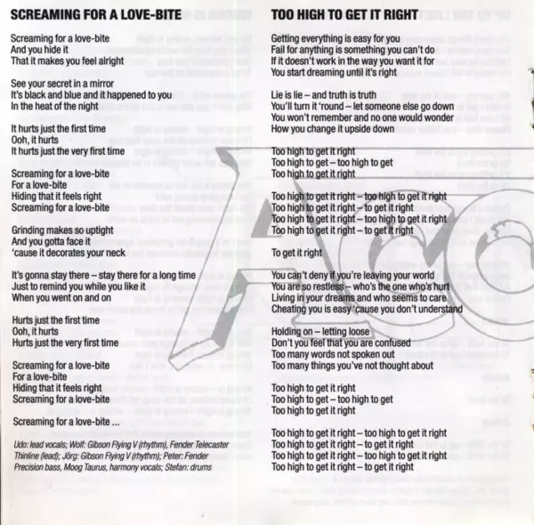 Bass [Fender Precision] Peter Baltes | Drums Stefan Kaufmann | Lead Vocals, Harmony Vocals Udo Dirkschneider | Rhythm Guitar [Gibson Fliyng V] Wolf Hoffmann | Rhythm Guitar [Gibson Flying V] Jörg Fischer