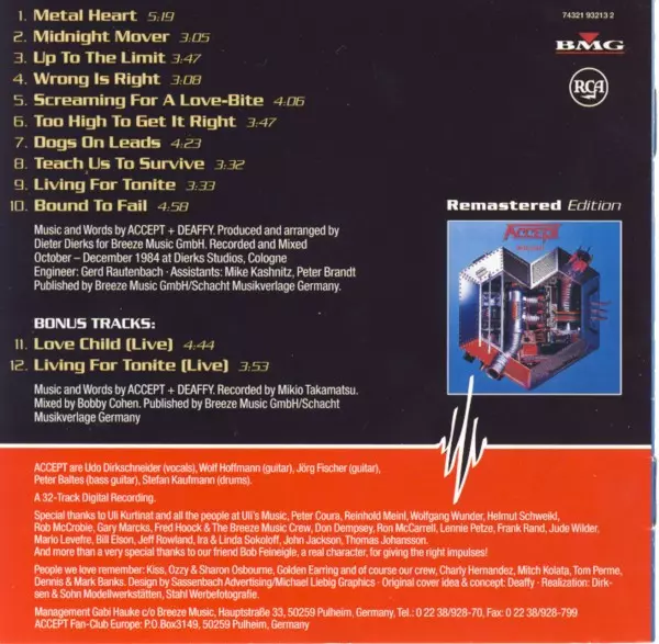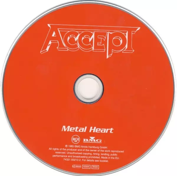 Accept: Metal Heart La version sur CD en Remasterisé édition. Cette édition particulière a été publiée en L'Europe dans la maison d'édition RCA En collaboration avec BMG Le 2 mars 2004.