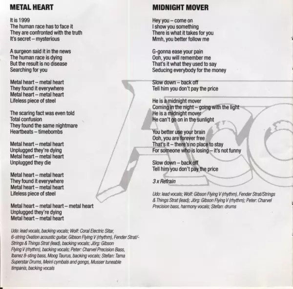 Bass [Charvel Precision, Ibanez 8-sting], Synthesizer [Moog Taurus], Backing Vocals Peter Baltes | Drums [Tama Superstar], Cymbal [Meinl], Gong, Timpani [Musser Tuneable], Backing Vocals Stefan Kaufmann | Lead Vocals, Backing Vocals Udo Dirkschneider | Rhythm Guitar [Gibson Flying V], Backing Vocals Jörg Fischer | Sitar [Coral Electric Sitar], Acoustic Guitar [6-string Ovation], Rhythm Guitar [Gibson Flying V], Lead Guitar [Fender Strat/-strings & Things Strat], Backing Vocals Wolf Hoffmann