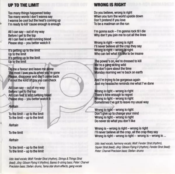 Bass [Fender Precision], Synthesizer [Moog Taurus], Backing Vocals Peter Baltes | Drums, Backing Vocals Stefan Kaufmann | Lead Vocals Udo Dirkschneider | Rhythm Guitar [Fender Strat/squire Strat], Lead Guitar [Strings & Things Strat], Backing Vocals Wolf Hoffmann | Rhythm Guitar [Gibson Flying V], Backing Vocals Jörg Fischer