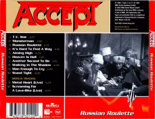 Sedmá LP deska Accept "Russian Roulette" se dostala do uší fanoušků v roce 1986 a okamžitě se v nich pevně usadila. Se skladbami "Heaven Is Hell", "Walking In The Shadows", "TV War" a "Monsterman" přinesla pětice ze Solingenu obvyklé pitoreskní zboží IG Schwermetall - vřele doporučované album pro fanoušky bezdechu!