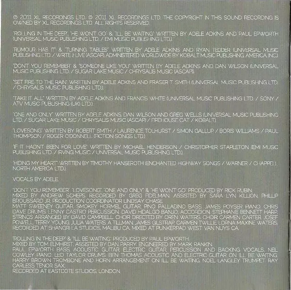 Engineer Greg Fidelman | Engineer [Assistant] Phillip Broussard, Sara Killion | Mixed By Andrew Scheps | Producer Rick Rubin | Written-By Adele Adkins, Paul Epworth