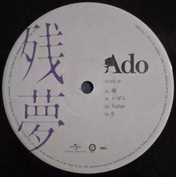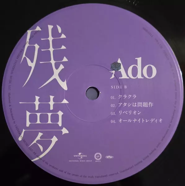 Ado: 残夢 LTD La version sur Le vinyle 2LP en Limité édition. Cette édition particulière a été publiée en Japon dans la maison d'édition Virgin Music En collaboration avec Universal Music Group Le 13 décembre 2024. Album couvre tous les genres Pop, Scène et écran, J-pop et Anison.
