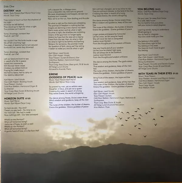 Bass Guitar, Synth [bass], Effects, Vocals, Lyrics By Terje Craig | Drums Alf Helge Lund | Electric Organ, Synth Odd-Roar Bakken | Guitar, Sitar [electric] Terje Flessen | Lead Vocals, Music By, Lyrics By Kjell Myran | Piano Atmasukha Ananda | Vocals Elen Catherine Hopen Furunes
