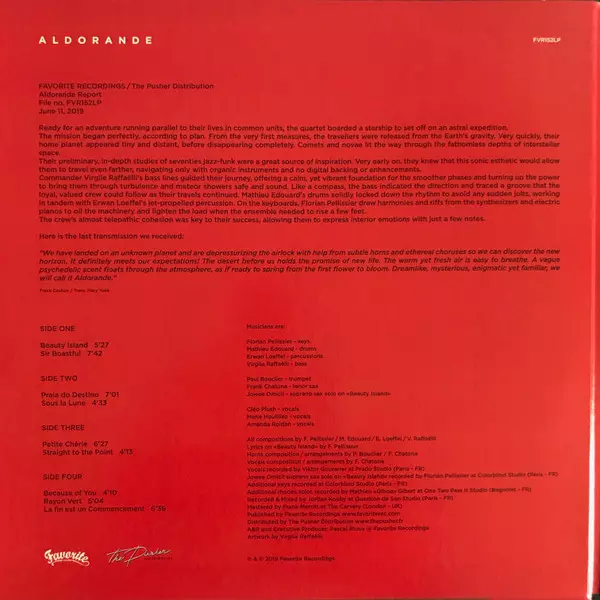 Aldorande is jazz-funk quarted led by bass player Virgile Raffaëlli , with Floran Pellissier on keys , Mathieu Edward on drums and Erwan Loeffel on percussion . In June 2019, they release their LP on Favorite Recordings. This musical UFO back from the seventies inherits from the ge...