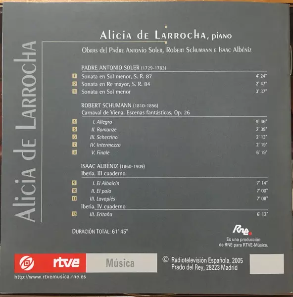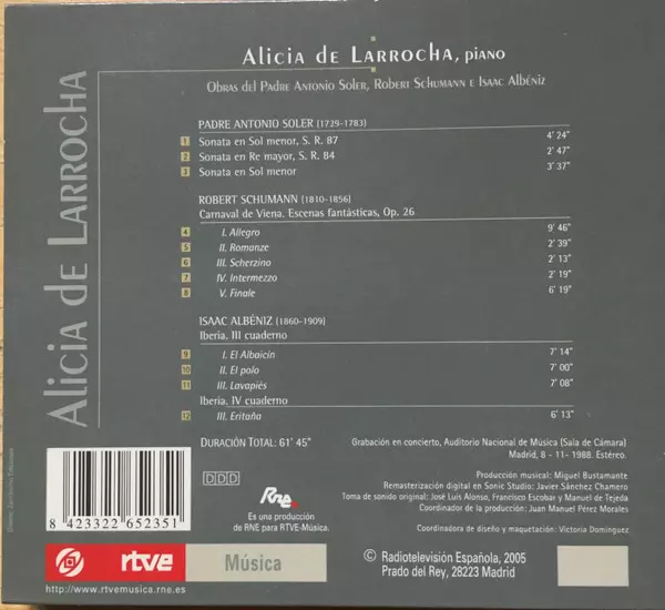 | Artiste | Robert Schumann | Isaac Albéniz | Alicia De Larrocha | Padre Antonio Soler |