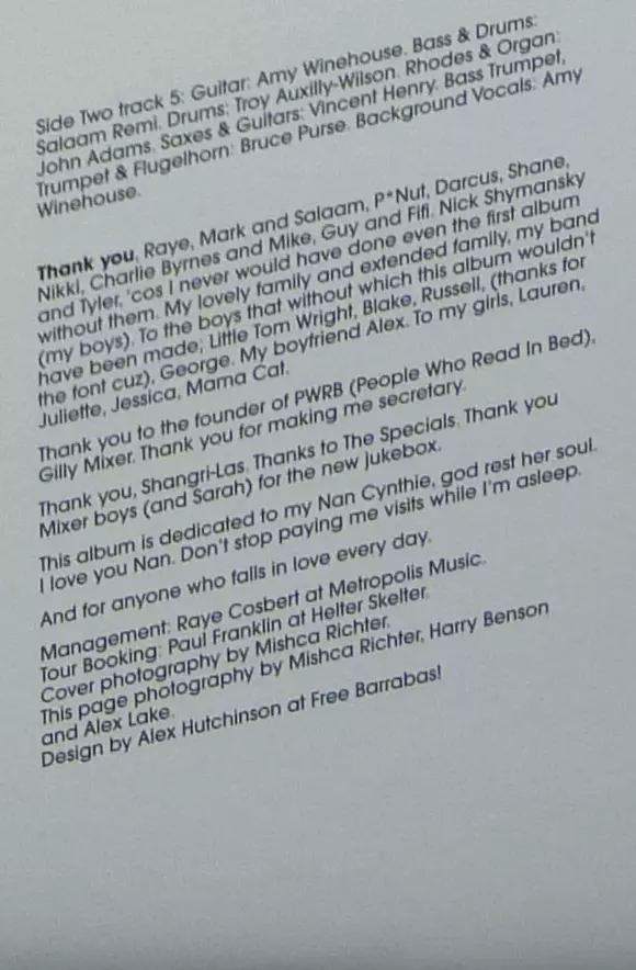 Bass, Drums, Guitar Salaam Remi | Guitar Vincent Henry | Guitar, Backing Vocals Amy Winehouse | Organ John F. Adams