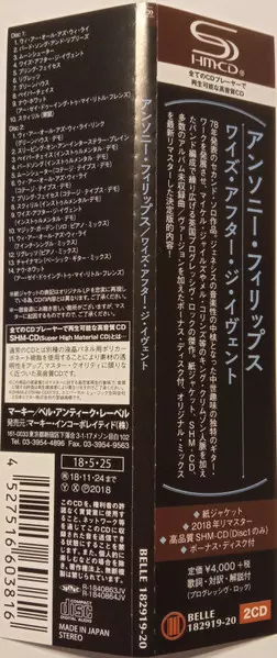 Anthony Phillips: Wise After The Event La version sur 2CD en Remasterisé édition. Cette édition particulière a été publiée en Japon dans la maison d'édition Belle Antique Le 1 juin 2018. Album couvre tous les genres Rock, Folk, World, & Country, Progressive rock et Art Rock. Shm CD Mini LP Sleeve.