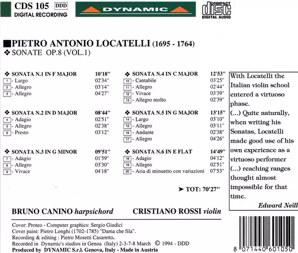 | Artiste | Pietro Antonio Locatelli | Bruno Canino | Cristiano Rossi |