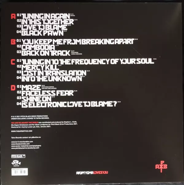 Apoptygma Berzerk: You And Me Against The World LTD La version sur Le vinyle 2LP en Limité édition. Cette édition particulière a été publiée en Norvège dans la maison d'édition Tatra En collaboration avec Pitch Black Drive Le 23 juillet 2021. Album couvre tous les genres Rock, Musique électronique, Alternative rock et Synth-Pop.