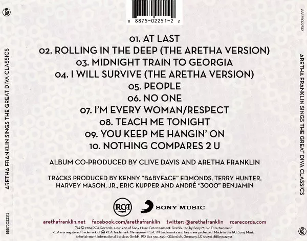 Aretha Franklin: Sings The Great Diva Classics La version sur CD en Norme édition. Cette édition particulière a été publiée en L'Europe dans la maison d'édition RCA En collaboration avec Sony Music Le 24 octobre 2014.