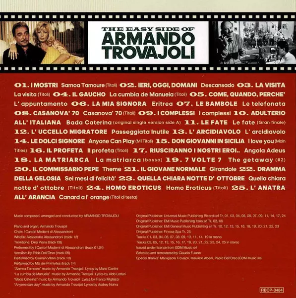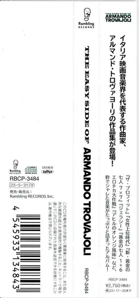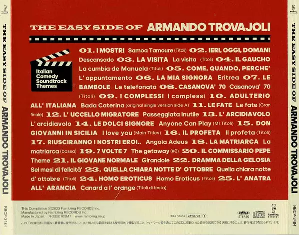 Armando Trovaioli: The Easy Side Of Armando Trovajoli La version sur CD en Norme édition. Cette édition particulière a été publiée en Japon dans la maison d'édition Rambling Records Le 7 juillet 2023. Album couvre tous les genres Pop, Scène et écran, Jazz, Musique facile à écouter, Score, Soundtrack, Latin Jazz, Bossa Nova et Light Music.