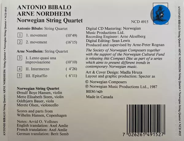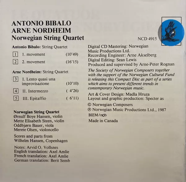 | Artiste | Arne Nordheim | Den Norske Strykekvartett | Antonio Bibalo |