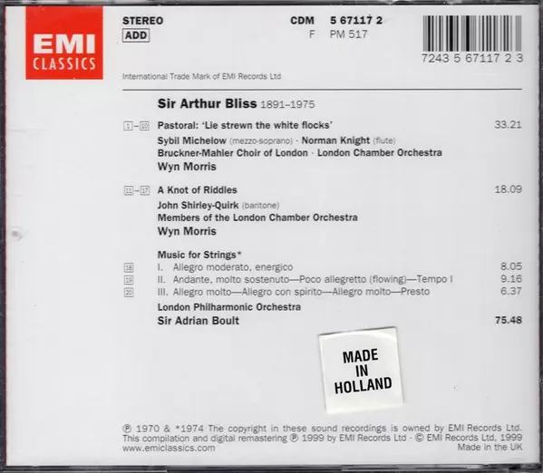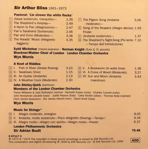 Artiste | London Philharmonic Orchestra | Sir Adrian Boult | John Shirley-Quirk | The London Chamber Orchestra | Arthur Bliss | Wyn Morris | Sybil Michelow | The Bruckner-Mahler Choir Of London |