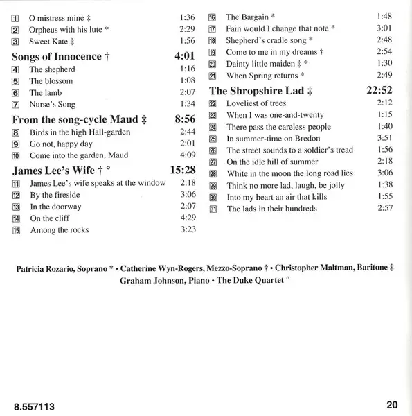 | Artiste | Christopher Maltman | Catherine Wyn-Rogers | Graham Johnson | Patricia Rozario | Sir Arthur Somervell | The Duke Quartet |
