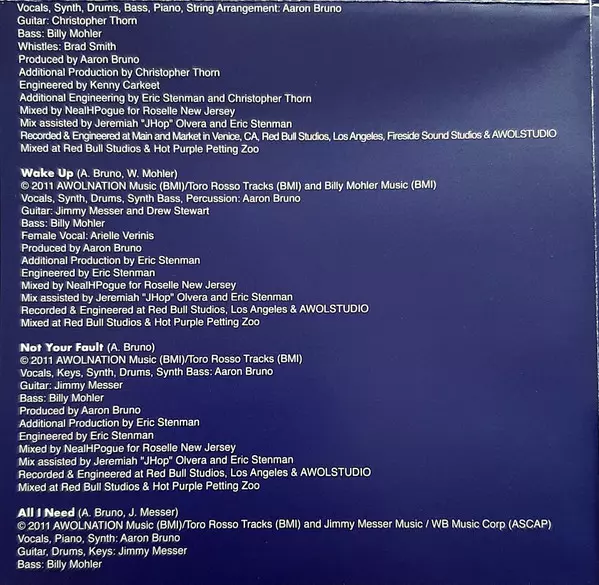 Bass Billy Mohler | Drums, Bass, Piano, Arranged By, Producer Aaron Bruno | Engineer Kenny Carkeet | Engineer [Additional] Eric Stenman | Guitar, Producer [Additional], Engineer [Additional] Christopher Thorn | Mixed By Neal Pogue | Mixed By [Assistant] Jeremiah Olvera | Whistling Brad Smith | Written-By Aaron Bruno