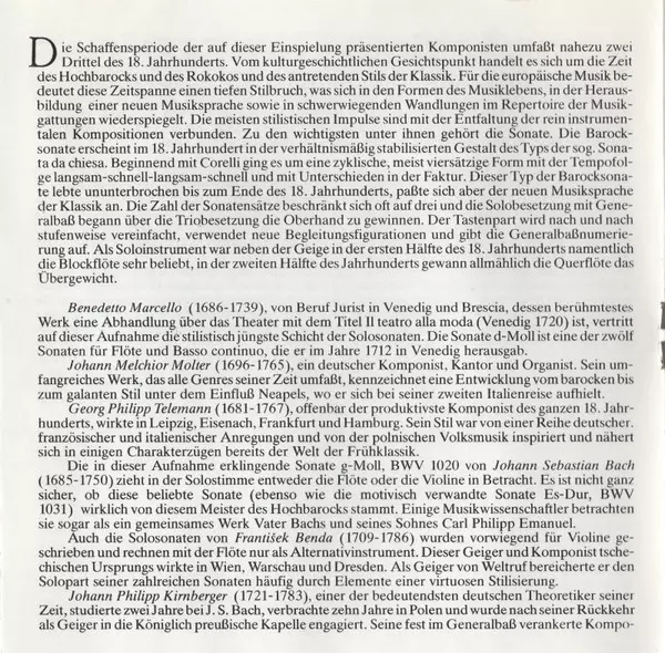 | Artiste | Johann Sebastian Bach | Georg Philipp Telemann | František Benda | Johann Melchior Molter | Johann Philipp Kirnberger | Benedetto Marcello | Sonatori Chamber Duo | Peter Brock | Berthold Fritz |