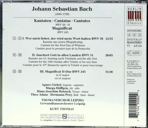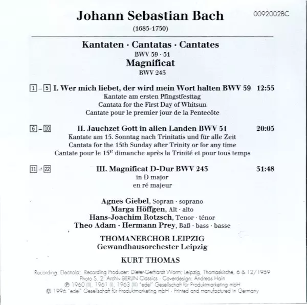 | Artiste | Johann Sebastian Bach | Gewandhausorchester Leipzig | Hermann Prey | Theo Adam | Thomanerchor | Hans-Joachim Rotzsch | Marga Höffgen | Agnes Giebel | Kurt Thomas |