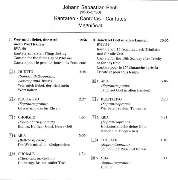 | Titre | Magnificat In D Major BWV 243 / Jauchzet Gott In Allen Landen! BWV 51 / Wer Mich Liebet, Der Wird Mein Wort Halten BWV 59 |