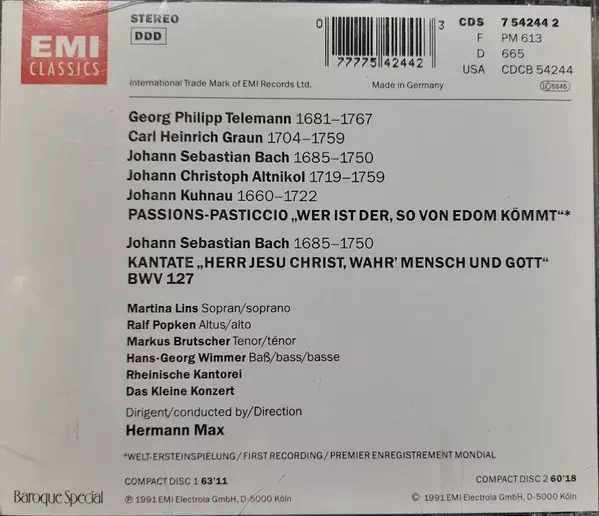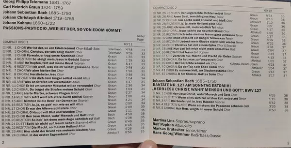 | Artiste | Johann Sebastian Bach | Georg Philipp Telemann | Carl Heinrich Graun | Rheinische Kantorei | Das Kleine Konzert | Hermann Max | Johann Christoph Altnickol |