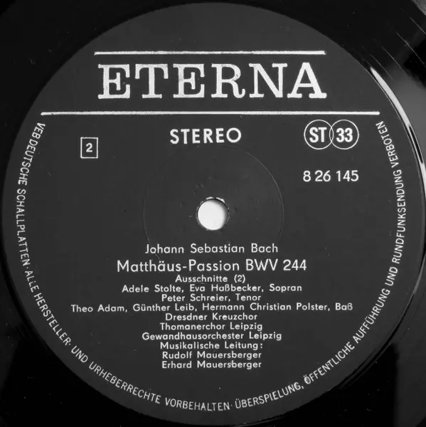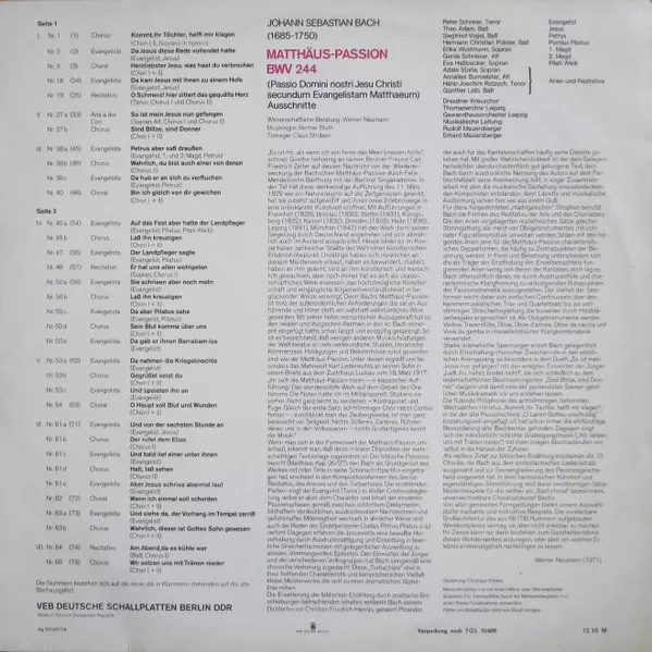 Artiste | Johann Sebastian Bach | Gewandhausorchester Leipzig | Peter Schreier | Thomanerchor | Theo Adam | Hans-Joachim Rotzsch | Annelies Burmeister | Dresdner Kreuzchor | Günther Leib | Erhard Mauersberger | Rudolf Mauersberger | Adele Stolte |