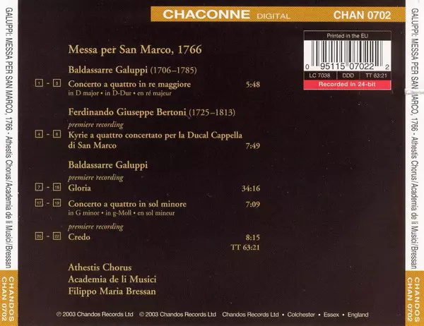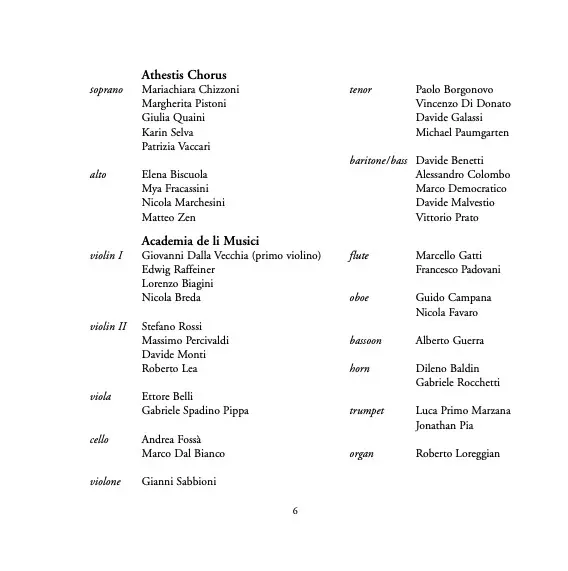 | Artiste | Baldassare Galuppi | Athestis Chorus | Filippo Maria Bressan | Academia de li Musici |
