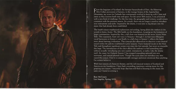 Jedná se o původní soundtrack k britsko-americkému televiznímu seriálu Ronalda D. Moorea, který vznikl na motivy románů Diany Gabaldonové "Outlander". Hudbu složil držitel ceny Emmy Bear McCreary, který je známý také svou prací na seriálech "The Walking Dead", "Battlestar Galactica" a videohře "God of War". V 5. sérii Fraserovi bojují o svou rod...