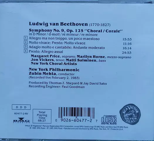 Artiste | Ludwig van Beethoven | Zubin Mehta | Marilyn Horne | New York Philharmonic | Margaret Price | Matti Salminen | Jon Vickers | Emanuel Ax | New York Choral Artists |