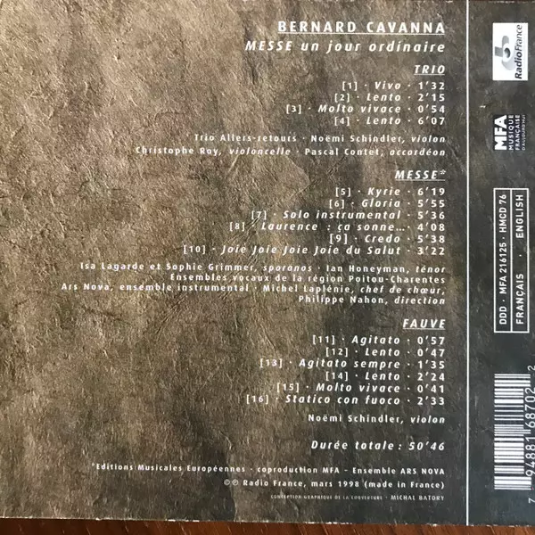 | Chorus Master Michel Laplénie | Conductor, Directed By Philippe Nahon | Ensemble Ensembles Vocaux De La Région Poitou-Charentes | Ensemble [Ensemble instrumental] Ensemble Ars Nova | Soprano Vocals Isa Lagarde, Sophie Grimmer | Tenor Vocals Ian Honeyman (2) | ||