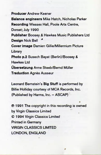 | Artiste | Leonard Bernstein | Bournemouth Symphony Orchestra | Jeffrey Kahane | Andrew Litton |