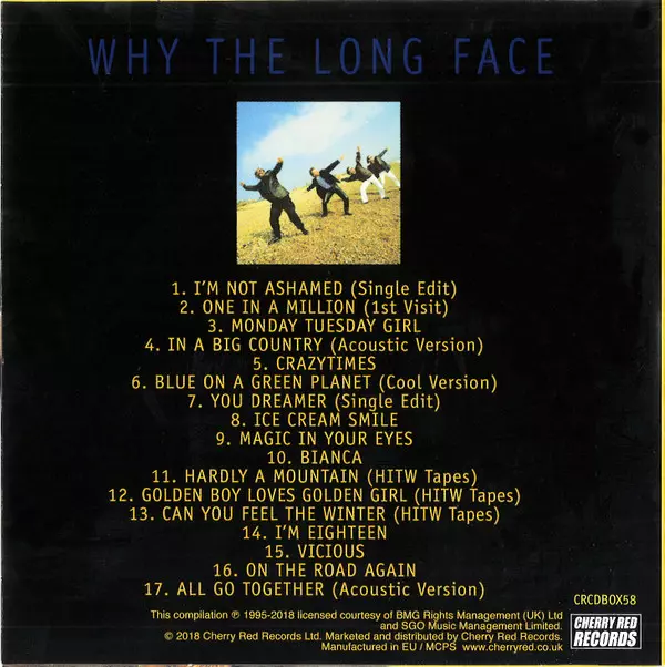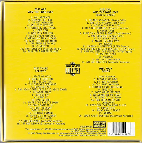 Big Country: Why The Long Face DLX La version sur 4CD/Coffret en deluxe Remasterisé édition. Cette édition particulière a été publiée en ROYAUME-UNI dans la maison d'édition Cherry Red Le 7 novembre 2025. Album couvre tous les genres Rock et Pop Rock. Deluxe Edition.