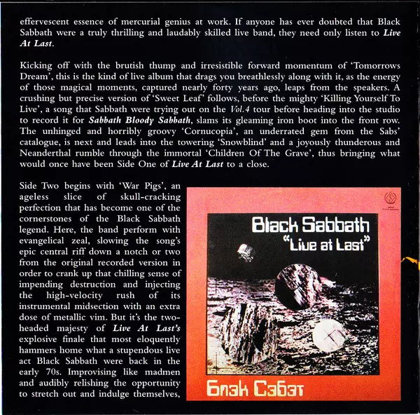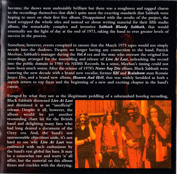 Black Sabbath : Live At Last is an album released in 1980. The album was recorded live at the Hammersmith Odeon in London on 26 November 1979. The album was produced by Black Sabbath and Martin Birch. The album was recorded during the Heaven and Hell tour. The album was the first live album released by Black Sabbath. The album was commercially s...