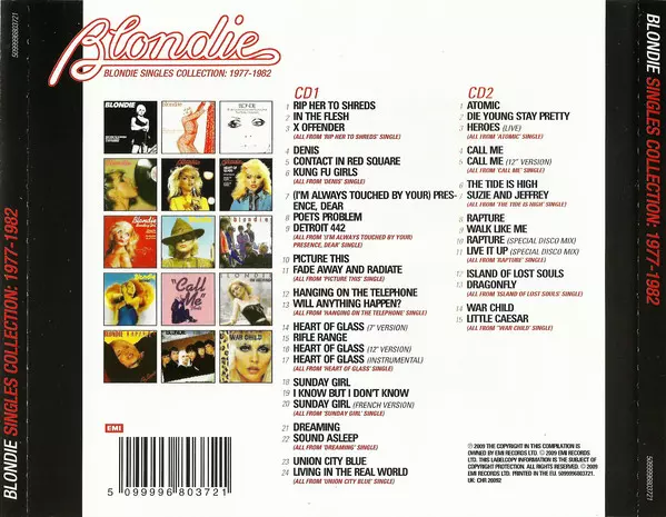 The BLONDIE Singles Collection brings together on two CDs, in chronological order, the 7" and 12" singles Blondie released on Chrysalis between 1977 and 1982. Among the nearly 40 titles are big hits like "Rip Her To Shreds", "Dreaming" and "Heart Of Glass", as well as rarities B-sides and remixes. This combination makes the BLONDIE Singles collection indispensable for BLONDIE fans and collectors.