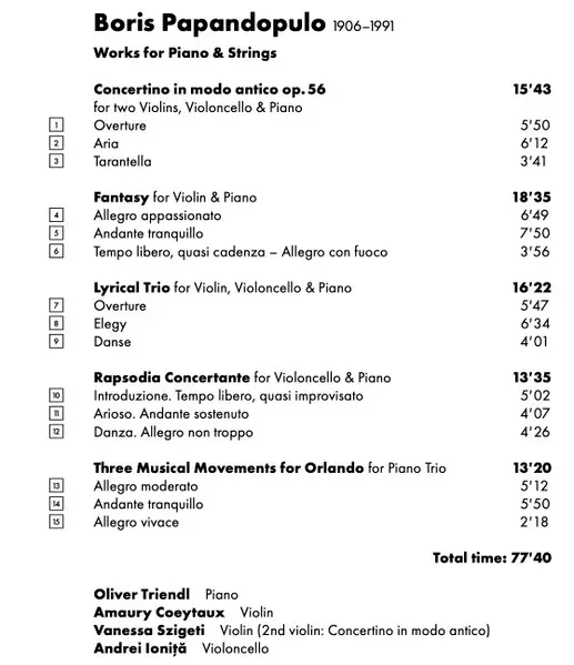 | Concertino In Modo Antico, Op. 56 For Two Violins, Violoncello & Piano | 15:43 min | |