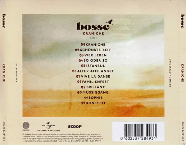 Bosse: Kraniche La version sur CD en Norme édition. Cette édition particulière a été publiée en Allemagne, Autriche et Suisse dans la maison d'édition Vertigo Le 8 mars 2013. Album couvre tous les genres Rock, Pop, Folk, World, & Country et Pop Rock.