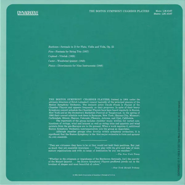 Bassoon Sherman Walt | Cello Jules Eskin | Clarinet Gino Cioffi | Composed By Walter Piston | Double Bass Georges Moleux | Flute Doriot Anthony Dwyer | Oboe Ralph Gomberg | Viola Burton Fine | Violin Alfred Krips, Joseph Silverstein