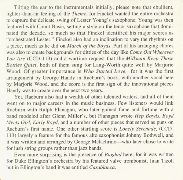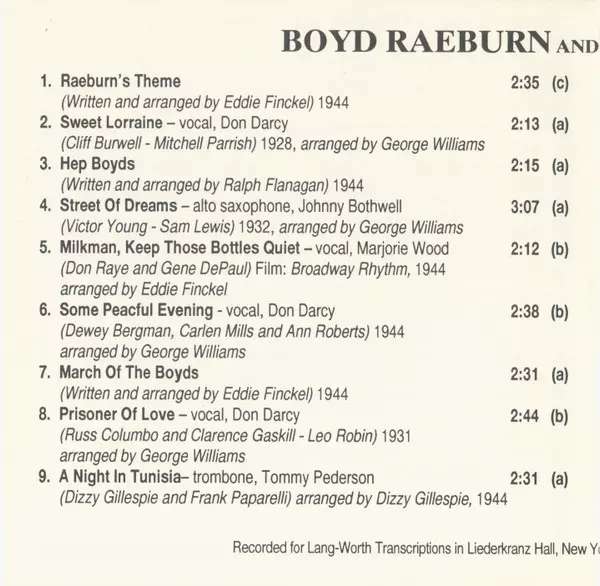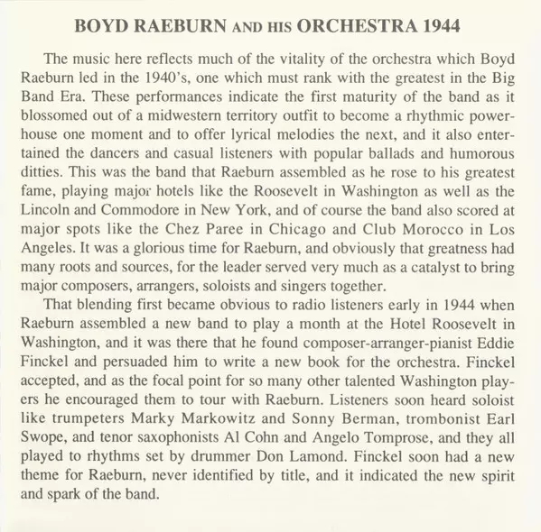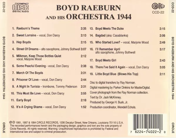 Boyd Raeburn And His Orchestra: 1944 La version sur CD en Remasterisé édition. Cette édition particulière a été publiée en ÉTATS-UNIS dans la maison d'édition Circle Le 12 août 1994. Album couvre tous les genres Jazz, Big Band et Swing.