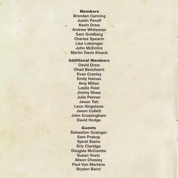 Bass Kevin Drew | Drums [Drums X2] Justin Peroff | Guitar Andrew Whiteman, Brendan Canning, Charles Spearin, Sam Goldberg (3) | Trombone Dave Hodge