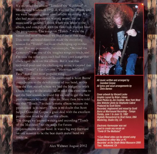 Cannibal Corpse's 1992 album Tomb of the Mutilated is a death metal classic. The album contains some of the band's most brutal tracks and is a continuous sonic assault that will leave you bruised and battered. From the opening track "Hammer Smashed Face" to the closing track "Addicted to Vaginal Blood", Tomb of the Mutilated is a continuous deat...