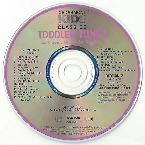 Cedarmont Kids: Toddler Tunes La version sur CD en Norme édition. Cette édition particulière a été publiée en ÉTATS-UNIS dans la maison d'édition Cedarmont Music En collaboration avec Benson Music Group et Benson Label Group, Inc. Le 1 mars 1996. Album couvre tous les genres Pop, Folk, World, & Country, Les enfants et Nursery Rhymes.
