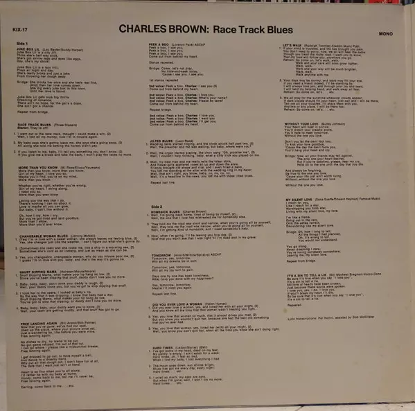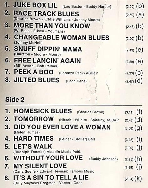 | A2 | Charles Brown, Johnny Moore's Three Blazers: Race Track Blues | 2:59 min | |