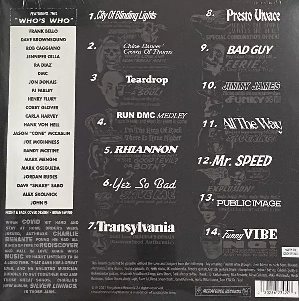 Charlie Benante: Silver Linings CLR La version sur Le vinyle 2LP en 45 RPM Coloré édition. Cette édition particulière a été publiée en Europe et États-Unis dans la maison d'édition Megaforce Records Le 6 août 2021. Album couvre tous les genres Rock, Pop, Blues, Hip Hop, Alternative rock, Punk, Progressive rock, Hard Rock, Funk Metal, Heavy Metal, Blues-Rock, Classic Rock, Grunge et Trip Hop. Coloured Grey & Purple Silver With Red Splatter Vinyl.