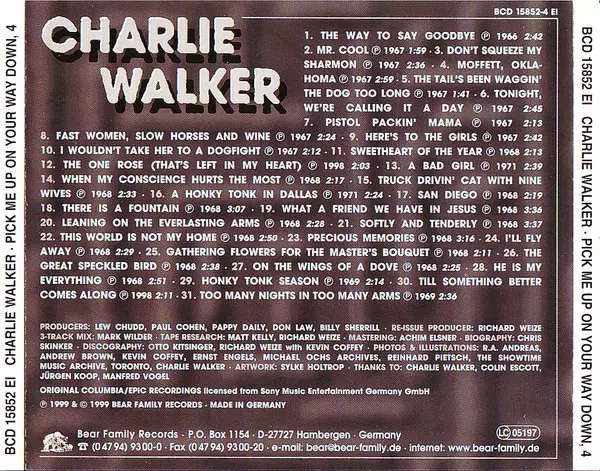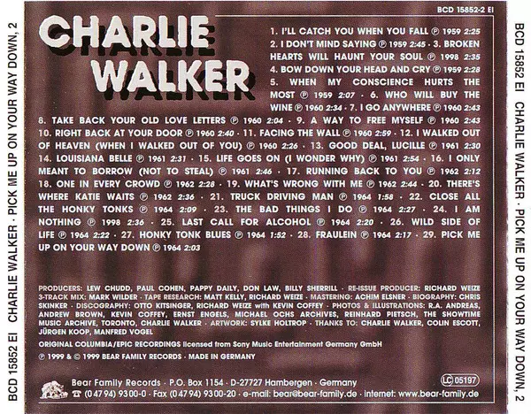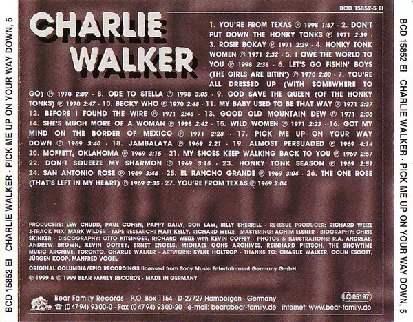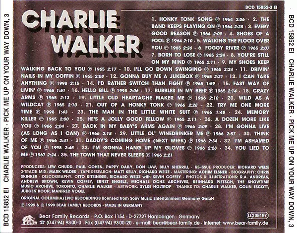 Charlie Walker: Pick Me Up On Your Way Down La version sur 5CD/Coffret en Norme édition. Cette édition particulière a été publiée en Allemagne dans la maison d'édition Bear Family Records année 2000. Album couvre tous les genres Folk, World, & Country et Country.