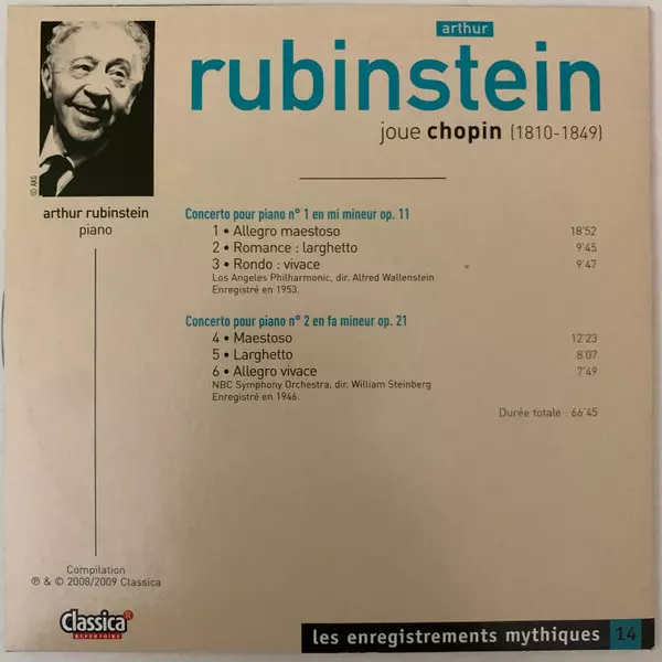 Arthur Rubinstein joue Chopin - concertos pour piano n° 1 et 2 - CD