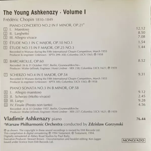 | Artiste | Frédéric Chopin | Vladimir Ashkenazy | Orkiestra Symfoniczna Filharmonii Narodowej | Zdzisław Górzyński |