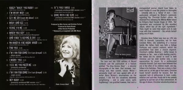 Christine Perfect: The Complete Blue Horizon Sessions La version sur CD en Remasterisé édition. Cette édition particulière a été publiée en L'Europe dans la maison d'édition Blue Horizon En collaboration avec Columbia Le 26 janvier 2023. Album couvre tous les genres Blues, Chicago Blues et Piano Blues.