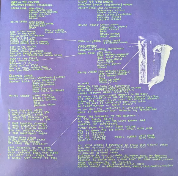 Lead Vocals [Harmony], Lead Guitar [Reverse], Rhythm Guitar [Echo], Bass, Bass [Octave Low Bass], Effects [Television] Helios Creed | Lead Vocals, Keyboards [Lead Yamaha], Keyboards [Bass Moog], Percussion [Slow Speed Bells], Effects [Television], Electronic Drums, Drums Damon Edge | Music By Helios Creed | Music By, Words By Damon Edge