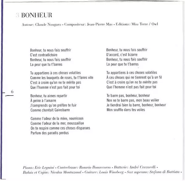 Bandoneon Lionel Suarez | Composed By Aldo Romano | Double Bass Rosario Bonaccorso | Drums André Ceccarelli | Guitar Louis Winsberg | Percussion Nicolas Montazaud | Piano Eric Legnini | Vocals, Lyrics By Claude Nougaro