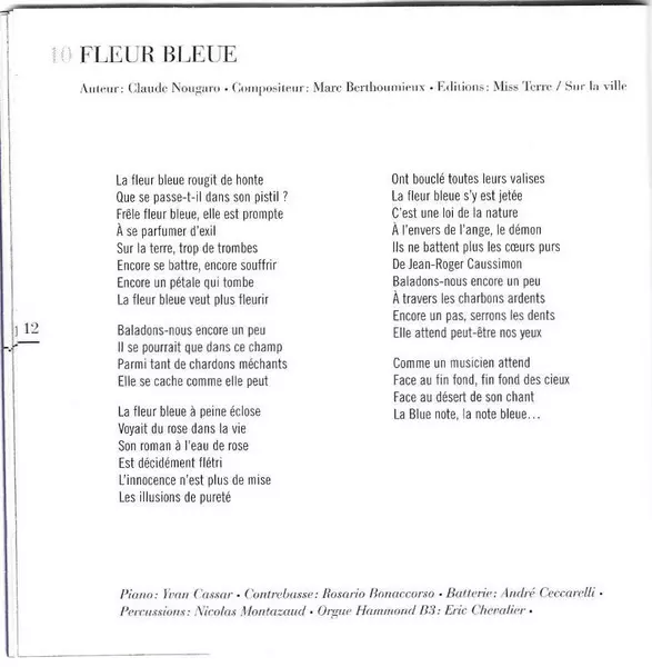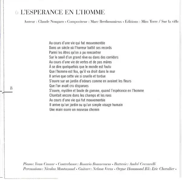 Composed By Marc Berthoumieux | Double Bass Rosario Bonaccorso | Drums André Ceccarelli | Electric Organ [Hammond B3] Eric Chevalier | Percussion Nicolas Montazaud | Piano Yvan Cassar | Vocals, Lyrics By Claude Nougaro